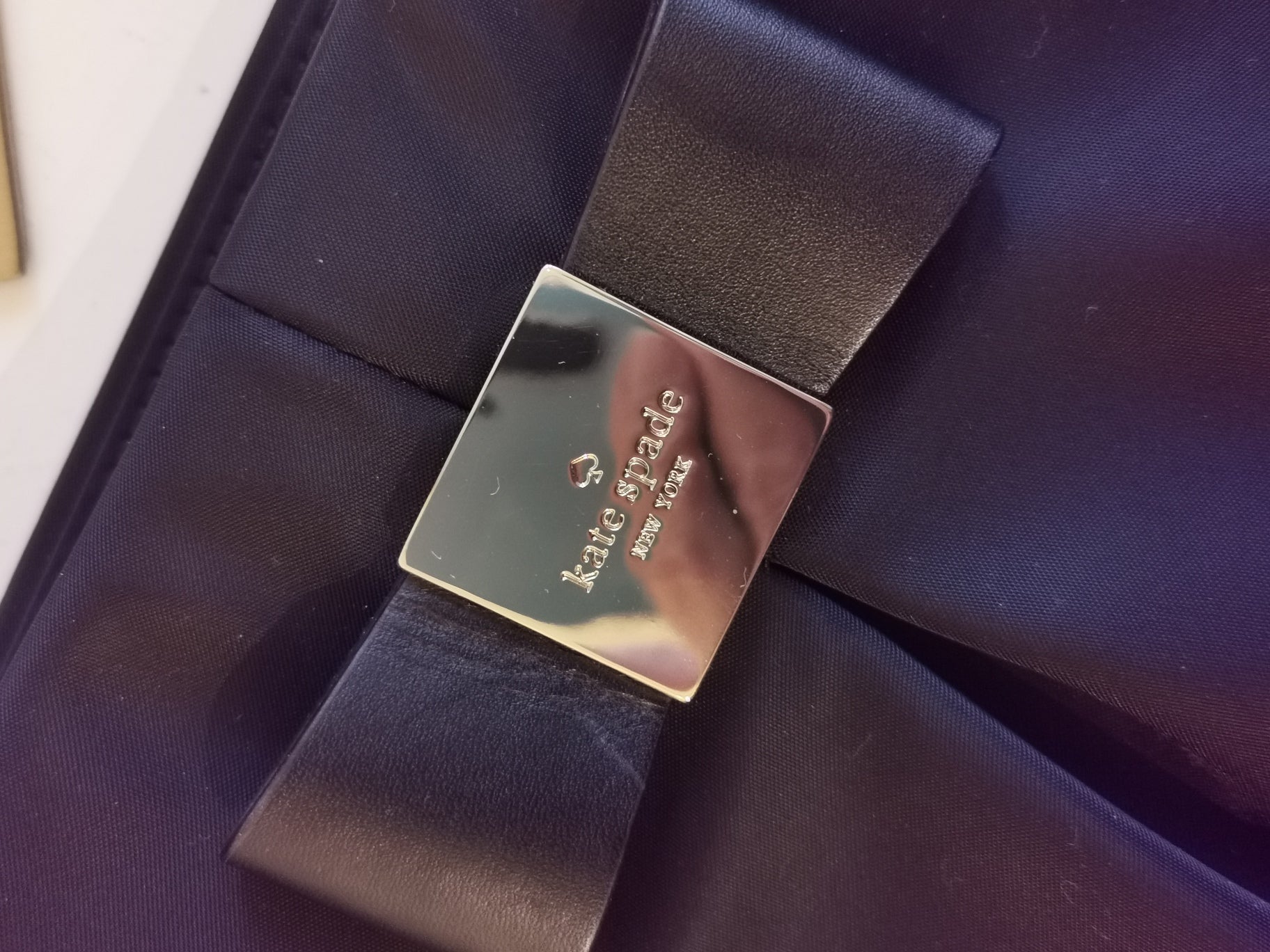 Elegant black nylon tote with front pleat topped with black bow and gold logo plate.
