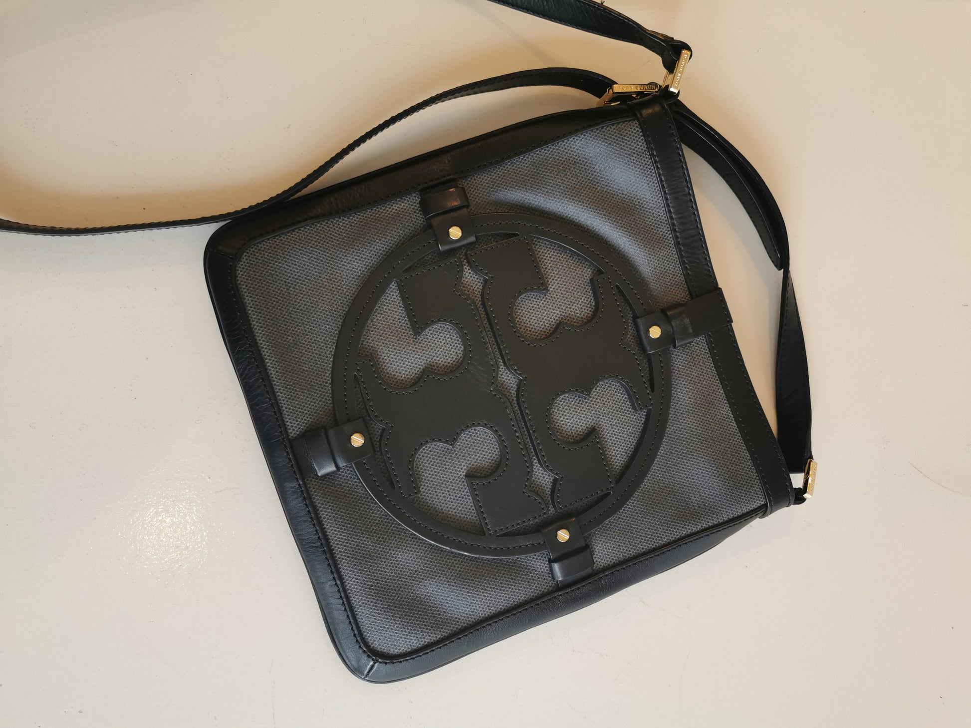 Black leather with large logo on front. Goldtone hardware. Adjustable strap. Prisitne condition. Comes with dust bag.