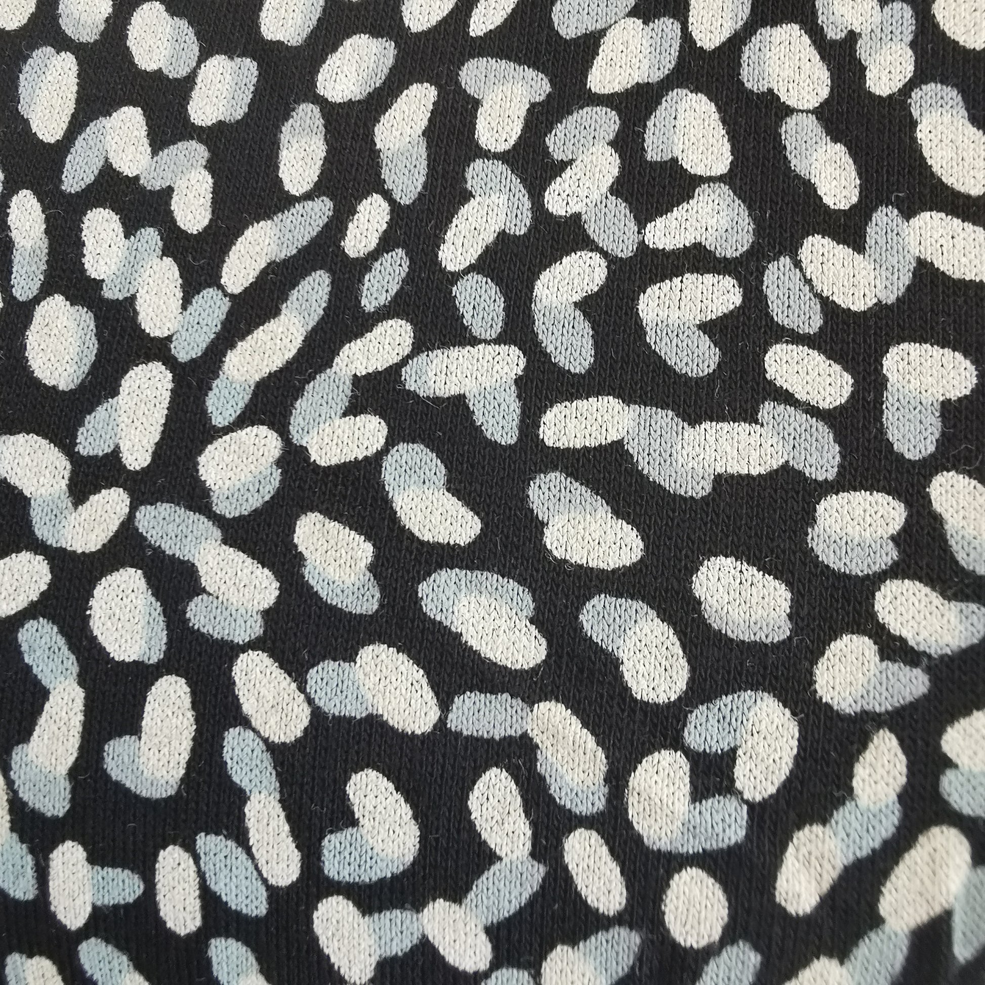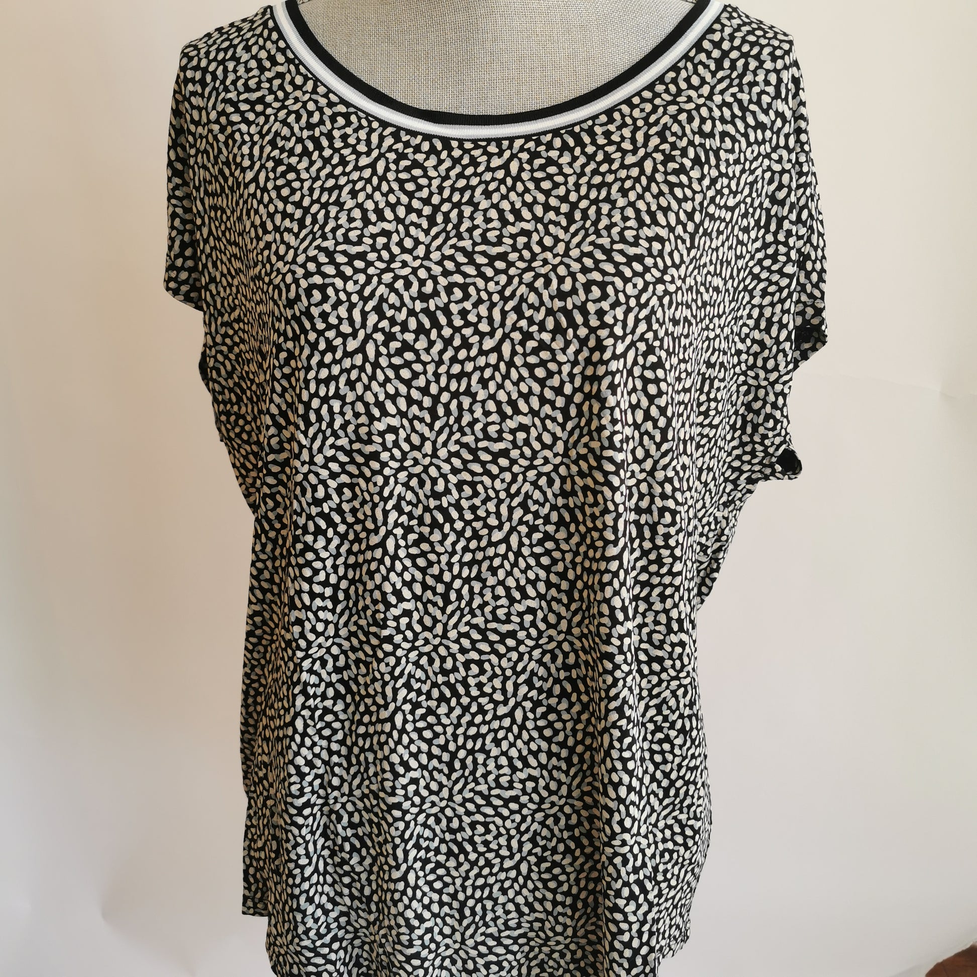 Check photo for print. Blue and beige on black background with contrasting wide scoop neckline. Short drop sleeve. Boxy, straight cut for ease.