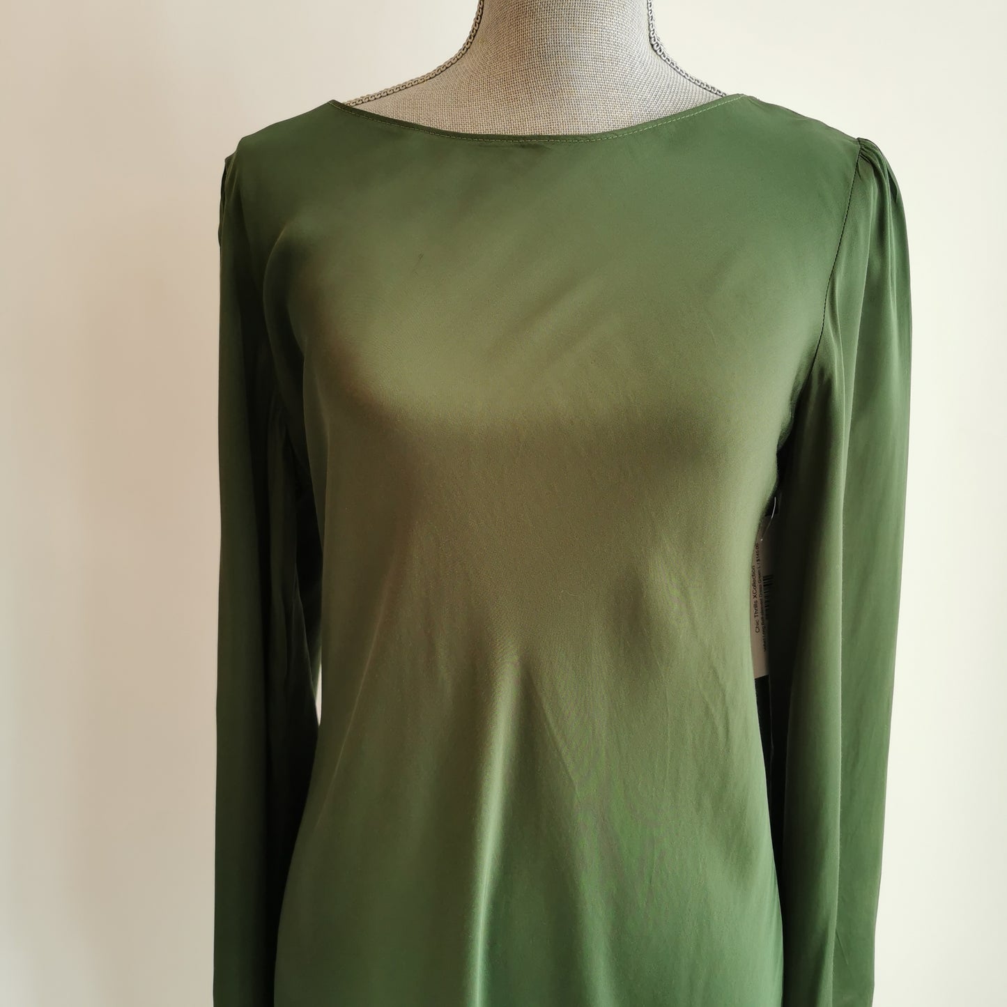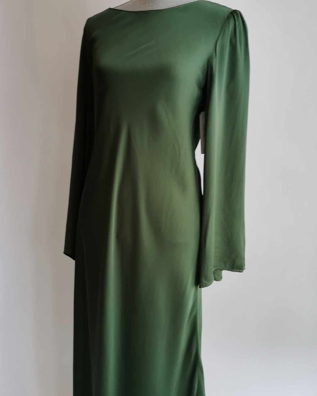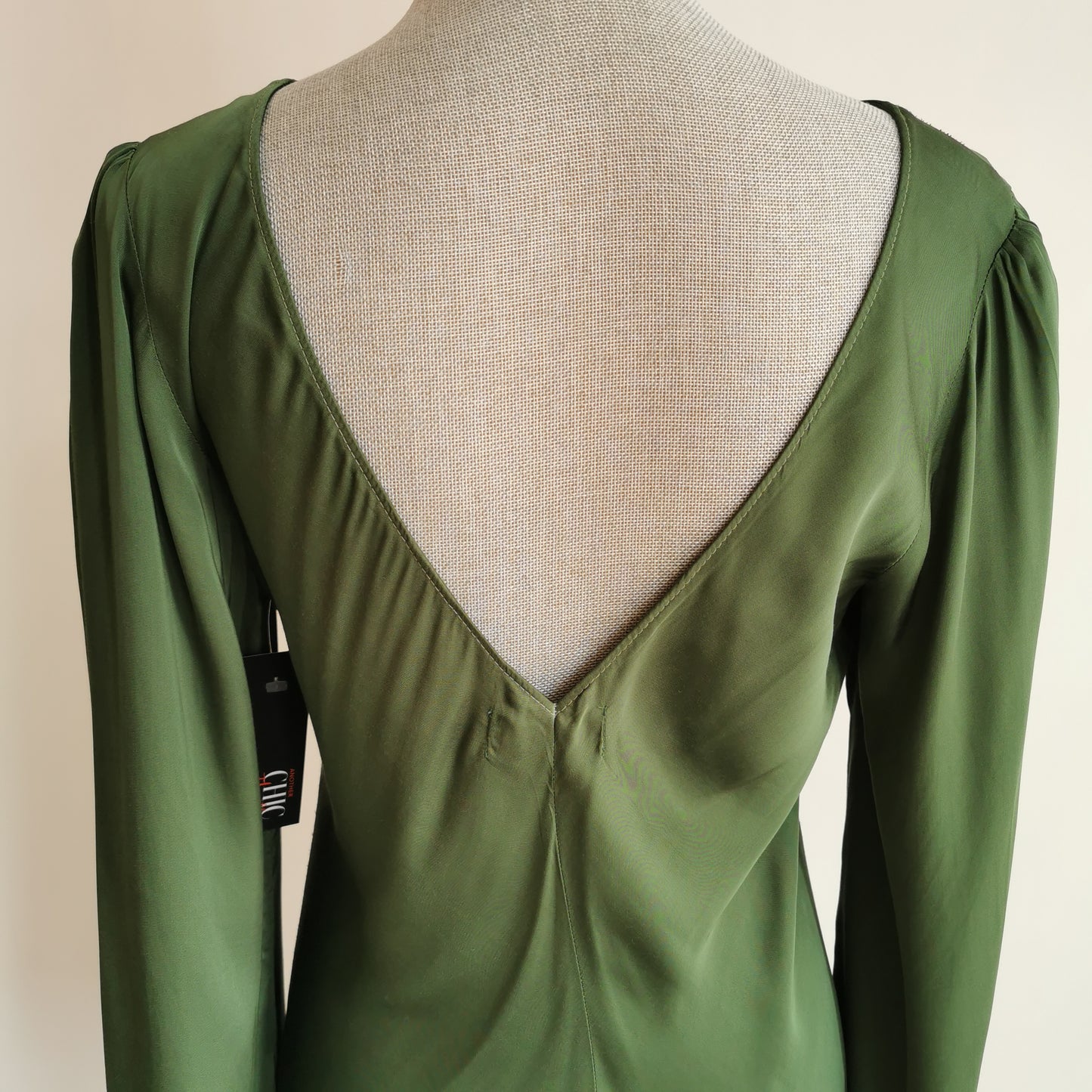 Simplicity itself. This beautiful, flowy long green gown with V-back is from the Velvet by Graham & Spencer line. Another selection from our Chic Thrills XCollection of pre-loved fashions. Sized as a L.