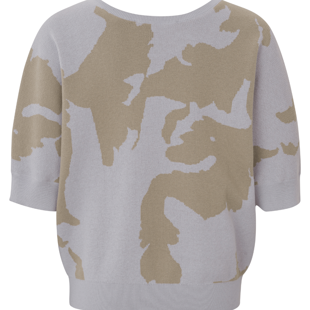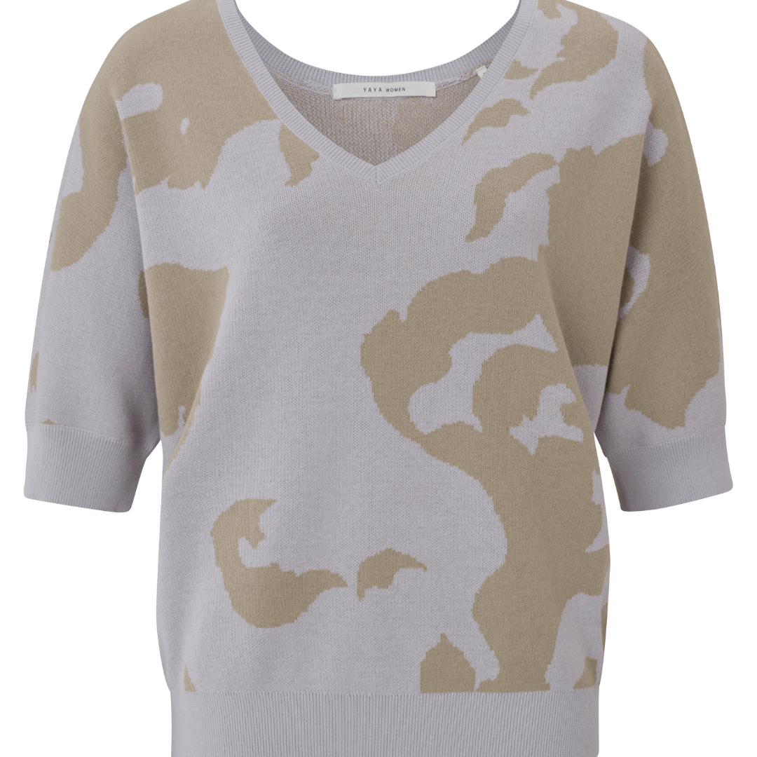 If soft colours are for you, you're going to love this number for fall 2023 from Yaya. Soft beige and mauve (dubbed evening haze) pattern. Dolman sleeve goes to elbow, makes for roomier top fit. Ribbed hem and neckline. 50% cotton/50% polyester